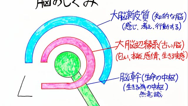 2020年6月8日 木下 成子 脳のしくみ 脳幹 脳幹 三層構造の一番下の部分の話です 「大脳新皮質」が意識的な活動をになっているのに対して「脳幹」は無意識の活動をになっています無意識の領域とは呼吸、睡眠、体温調整、代謝と生命維持には欠かせない大事なことばかりですこうい […]
